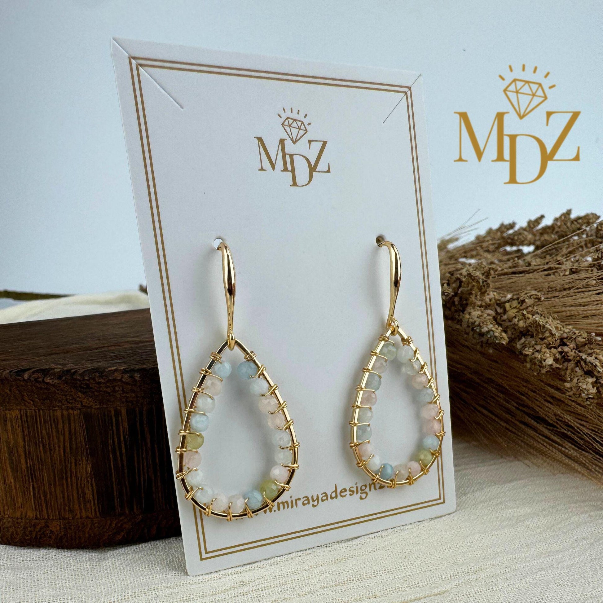 18K Gold Wire Wrapped Gemstone Teardrop Dangle Earrings : Minimalist Handmade Beaded Jewelry