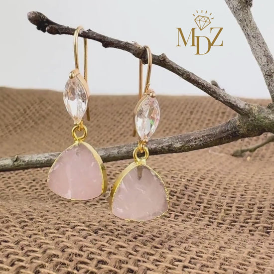 Gold Rose Quartz Dangle Earrings: Raw Gemstone Bridal Jewelry