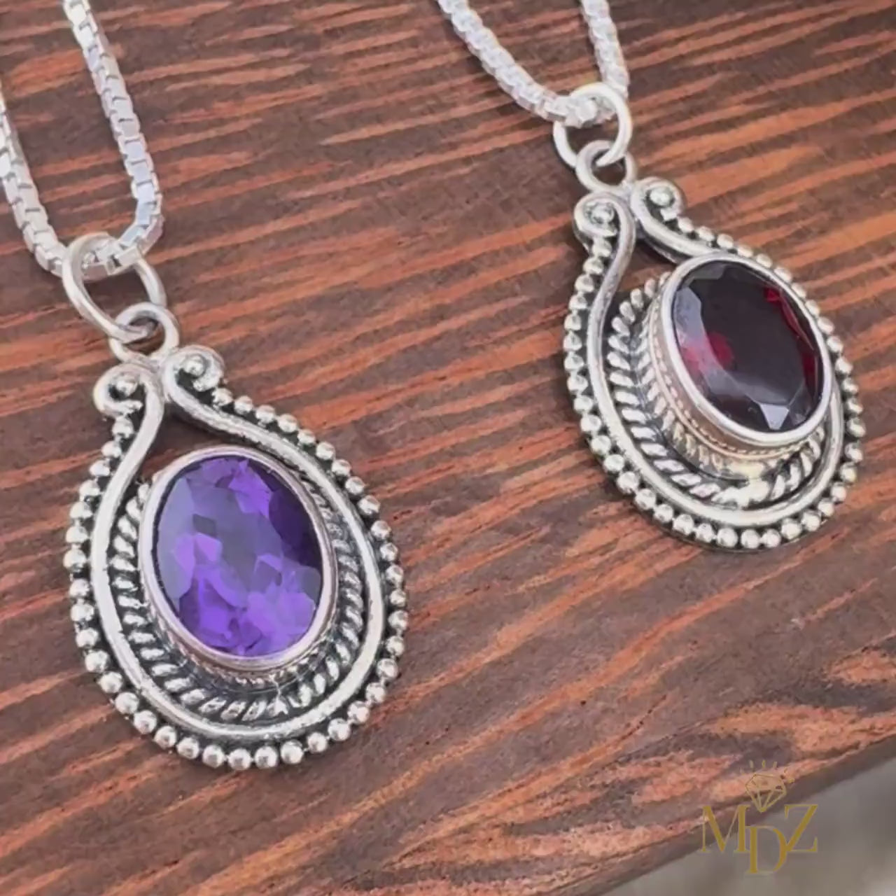 Vintage Oval Sterling Silver Pendant with Amethyst or Garnet